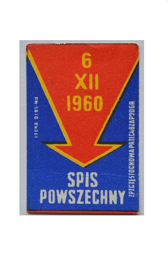 Paczka papierosów i pudełko zapałek. Dość sfatygowane przez upływ czasu, choć kolory pozostały wyraźne. Na etykiecie zapałczanej czerwona strzałka o ostrych konturach podkreślonych żółtą obwódką. Uderza z góry podobnie jak piorun, ale jest na niego zdecydowanie zbyt gruba. Raczej rozlewa się jak lawa spływająca z wulkanu, jej gorący jęzor sunie po powierzchni barwy ultramaryny. Ciągnie ze sobą datę: 6 XII 1960. Ostrze strzałki przynosi odpowiedź na pytanie, co wydarzyło się tego dnia: spis powszechny.